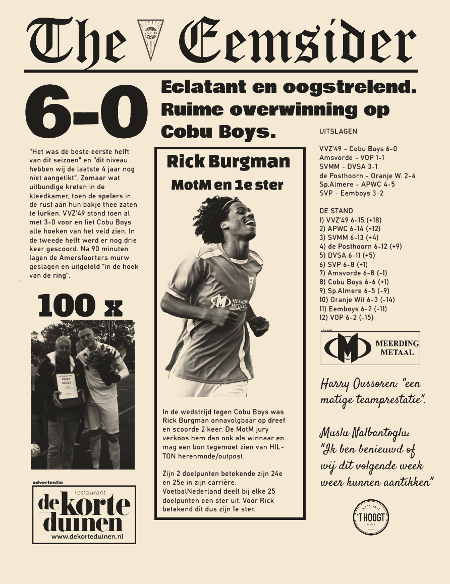 Al vanaf het eerste fluitsignaal merkten wij dat het met de inzet en werklust wel snor zat vandaag. Binnen 5 minuten veerde wij al twee keer op. Allereerst was Tahsin net niet alert genoeg om een voorzet ook daadwerkelijk te beroeren en enkele minuten later was het Sven die zijn schot net nog geblokt zag worden. Trainer Muslu Nalbantoglu (Moes voor intimie) bekeek het van een afstandje en zei tegen de rest van de staf: ‘We zijn goed begonnen boys”…… Deze woorden waren nog niet uitgegalmd of Jip kreeg het op zijn heupen. Met een prima beweging speelde hij zich vrij richting achterlijn en gaf voor op Sven van de Munt. Sven bedacht zich geen moment en drukte alweer zijn 6e doelpunt van het seizoen tegen de touwen. Moes bekeek dit weer met een grote glimlach en zij: “Dit is het beste kwartier van het seizoen”…….In minuut 18 wederom een aanval die de handen op elkaar kreeg. Danny stoomde op over de rechter flank en gaf voor richting Jip. Met een geweldige “touch” achter het standbeen langs wist hij net niet de keeper te verrassen. Halverwege de tweede helft weer een luid gejuich. Een diepe bal werd door Rick met de borst gecontroleerd en direct over de doelman gevolleerd. Rick was dit keer het middelpunt van het feestgedruis, maar dit werd binnen enkele tellen de kop in gedrukt. Het vlagsignaal werd door de scheidsrechter gehonoreerd en het schitterende doelpunt werd, naar later werd verklaard, onterecht afgekeurd. Toen Moes de teleurstelling verwerkt had hoorde wij hem weer zeggen: “Dit zijn de beste 20 minuten van het seizoen boys”……Het mocht allemaal niet baten voor Cobu Boys. VVZ’49 won alle afvallende ballen en had niks te duchten van de Amersfoorters. De jubilerende Daan kreeg alleen maar een enkele terugspeelbal te verwerken. Na ruim een half uur op de klok week Sven uit naar de linker kant, waar hij plichtsgetrouw achter een bal aanging. Uit een ogenschijnlijke moeilijke situatie wist hij de bal zeer knap richting Rick Burgman te krijgen. Met de aanname speelde hij zich direct vrij en schoot de bal achter de verbouwereerde doelman.2-0. Op zeven minuten voor de rust was het Danny die Jip het leder schonk. En als Jip aan de bal is, ging iedereen vandaag op het puntje van de stoel zitten. Jip omspeelde de eerste tegenstander gemakkelijk en de 2e weergaloos. De voorzet was eigenlijk niet echt zuiver, maar Tahsin geloofde er nog wel in. Zijn voorzet op Sven was prima, de krul nog beter. 3-0.